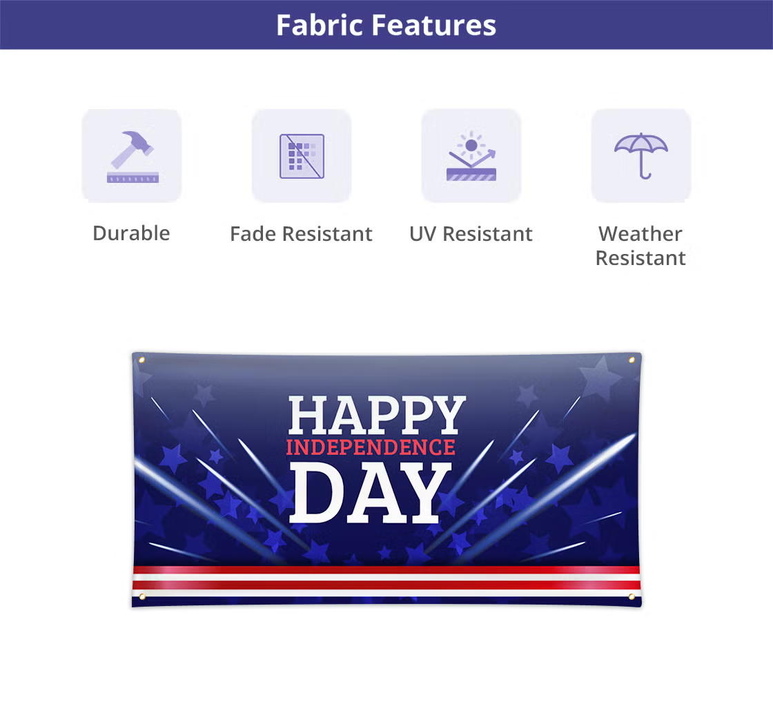 Made from premium PVC flex, our high-quality 4th of July banners are designed for longevity. The 13 oz version is available for regular use, while the 16 oz variant offers enhanced durability. Our single sided banners boast a pristine white front and a grey back, delivering sharp, high-resolution imagery. The double-sided 4th of July banner has a 600 DPI UV print, ensuring vivid and striking graphics visible from both sides, while the single-sided banners have 720 DPI eco-solvent print.