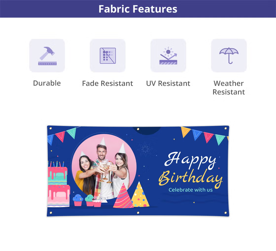 Our affordable birthday banners are constructed from the finest PVC Flex, ensuring longevity and resilience. Available in two thicknesses, you can choose the standard 13 oz or upgrade to the heavier 16 oz graphic weight for a more premium finish. With state-of-the-art printing technology, 720 DPI eco-solvent for single-sided and 600 DPI UV for double sided birthday banners, each banner boasts sharp, vivid imagery that withstands various weather conditions, making them suitable for both indoor and outdoor use.