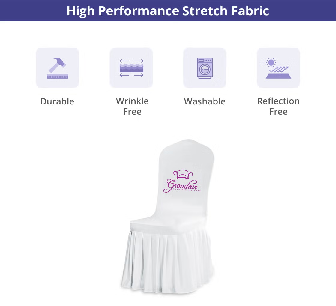 Crafted from premium stretchable fabric, our custom chair covers offer exceptional quality and fit. Each cover showcases vibrant, full-color dye-sublimation printing at a detailed 1440 DPI resolution, ensuring your graphics stand out with clarity. The fabric, with its 70/30% stretchability and 5.3 oz weight, guarantees durability and superior value. Designed for both aesthetics and functionality, our decorative chair covers feature multiple pleats at the lower part, offering an attractive appeal while aiding in hassle-free placement. This design is ideal for those seeking to create a cohesive and impressive look across their event space.