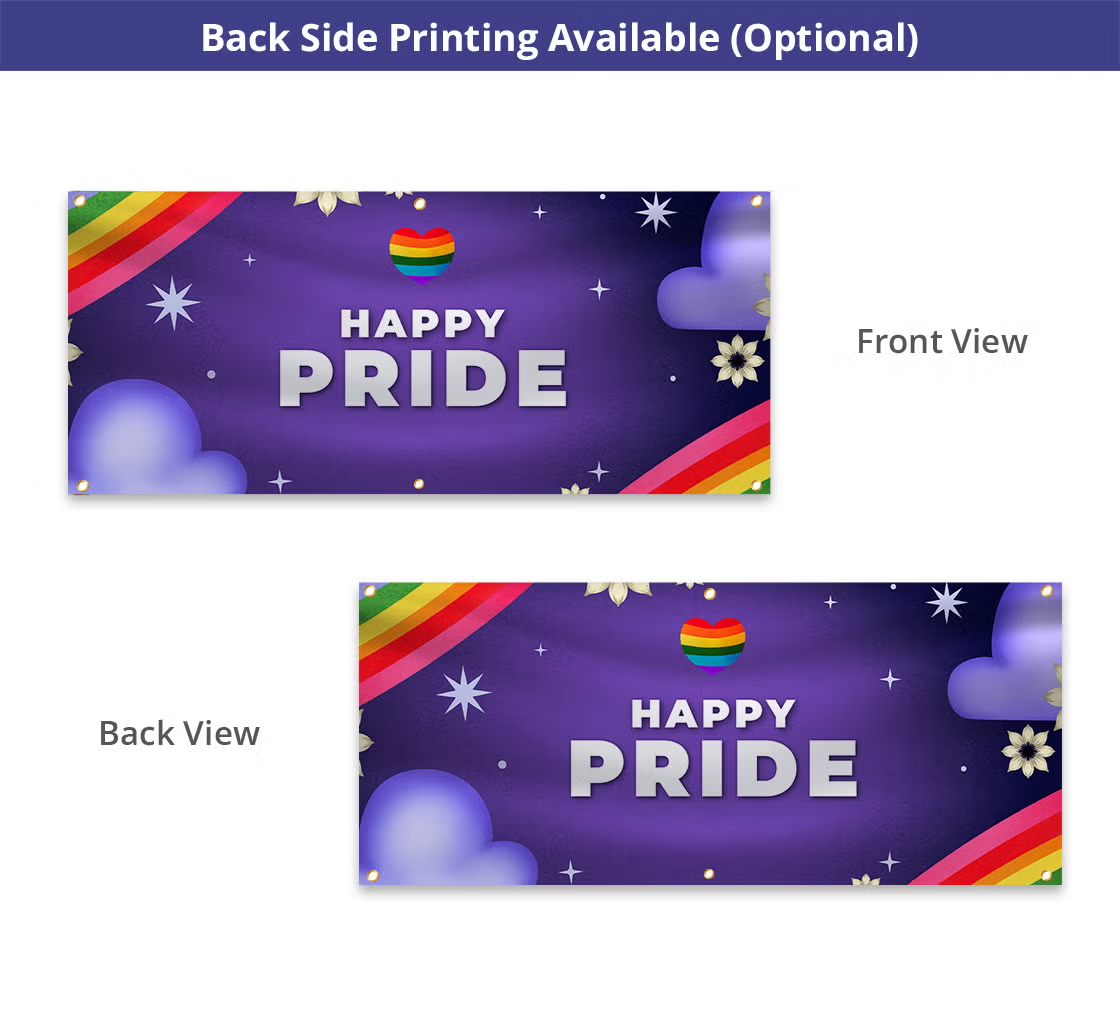 Our banners are available in custom sizes to fit your specific needs, as well as popular standard sizes for quick and easy ordering. Customize your pride banners with options for either single-sided or double-sided rainbow pride banners, each designed to meet specific display needs. Design online, upload your artwork, or collaborate with professional designers to ensure your banner perfectly captures your message. Choose from a variety of hanging options such as pole pockets, brass grommets, or ultra-strong adhesive tabs for easy setup. Opt for lamination for outdoor use to enhance durability, protect colors, and provide abrasion and chemical resistance. Wind flaps are also beneficial in windy situations by reducing wind load and preventing damage.